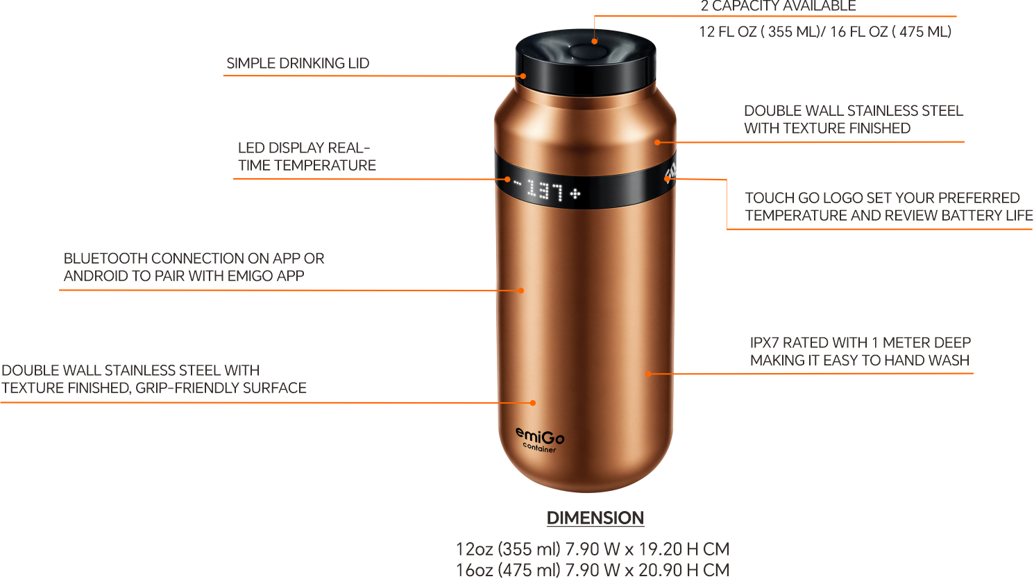 The emiGo TempMaster Travel preserves your selected temperature for up to 2 hours with a 355 ml (475 ml) capacity, ensuring your hot beverage remains at its ideal state. Moreover, Safe for hand washing and boasts an IPX7 waterproof sealing rating for added peace of mind.